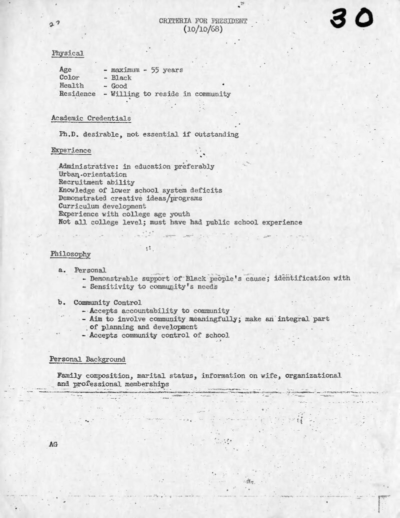 Created by the Bedford-Stuyvesant community, this paper outlines their criteria for the president of Community College No. 7 (later named Medgar Evers College). Including experience, physical appearance, philosophy and personal background, among the factors to be considered are an individual who "accepts community control of the school."