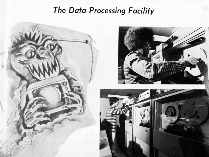 Printed in Prism, BMCC's 1971 yearbook, these photographs show students working in the college's data processing facility. The college offered several Data Processing courses and by the end of the decade had set up four data laboratories for student use.