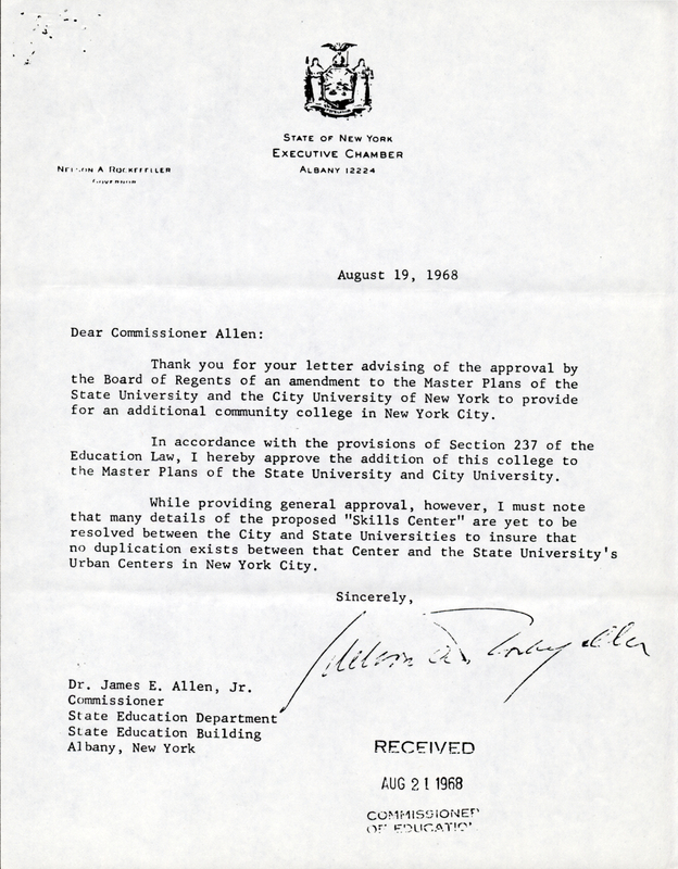 This NY State letter of approval for additional community college (# seven) is signed by Governor Nelson Rockefeller and directed to James Allen, his Commissioner of the State Education Department. He notes that it has yet to be confirmed that no duplication exists between this "Skills Center" and any other "State University's Urban Centers in New York City."