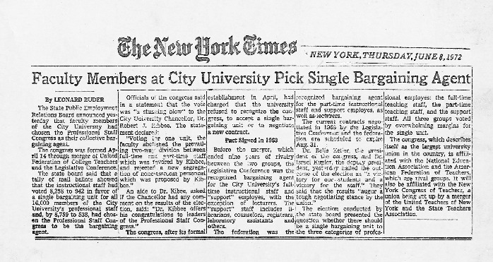 This New York Times article reports the results of a June 1972 election among members of the CUNY instructional staff. Voters elected to form a single bargaining unit for CUNY, with an overwhelming number choosing the newly formed Professional Staff Congress (PSC) as the bargaining agent of choice. The election ended a dispute stretching back to 1968 over how many bargaining units there should be in CUNY and which organization would represent which unit. Previously, staff at CUNY were represented by either the Legislative Conference or the United Federation of College Teachers; despite popular support, their merging of the two was not a smooth process in the early years of the new union. Nevertheless, their unification allowed for the leaders from the two competing groups to redirect their focuses away from their rivalry towards better addressing the needs of faculty and staff at CUNY.