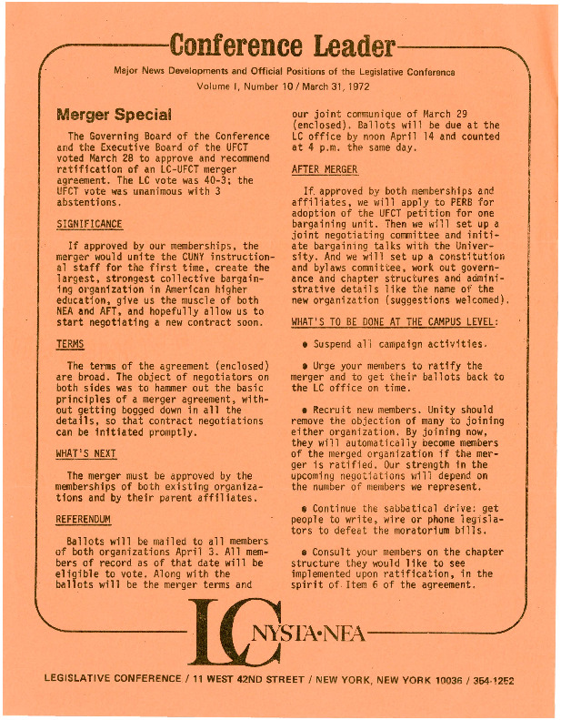 In this leaflet, the Legislative Conference (LC) announces that their merger with the United Federation of College Teachers (UFCT) had been approved by the governing boards of both organizations, and that it now would be submitted to the memberships for a vote. In the subsequent referendum, the merger was overwhelmingly supported by the members of both organizations and the new union, the Professional Staff Congress/CUNY (PSC), came into existence in April 1972. Previously, the rival groups coexisted at CUNY with the LC representing full time instructors and staff and the UFCT part-time faculty, staff, and lecturers. Their merging would be a contentious one as leadership from both groups would struggle to wrest control of the PSC in its early years.