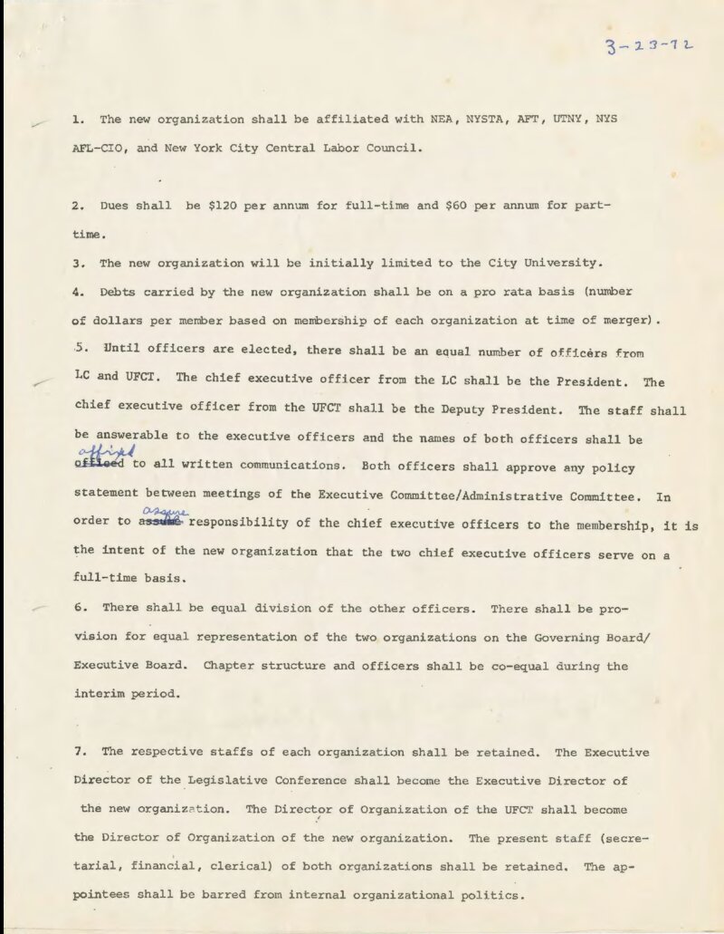 This is the full text of the merger agreement between the Legislative Conference (LC) and the United Federation of College Teachers (UFCT). The agreement was approved by the governing board of each organization, and then by the membership of each union; it took effect on April 14, 1972 with the new union called the Professional Staff Congress/CUNY (PSC). The groups had previously competed with one another as each was guided by a different philosophy and represented different members of staff and faculty across CUNY campuses. While their merging ultimately allowed the leaders of both to better focus their efforts on the needs of union members, competition between the two sides still remained in the early years of the PSC.