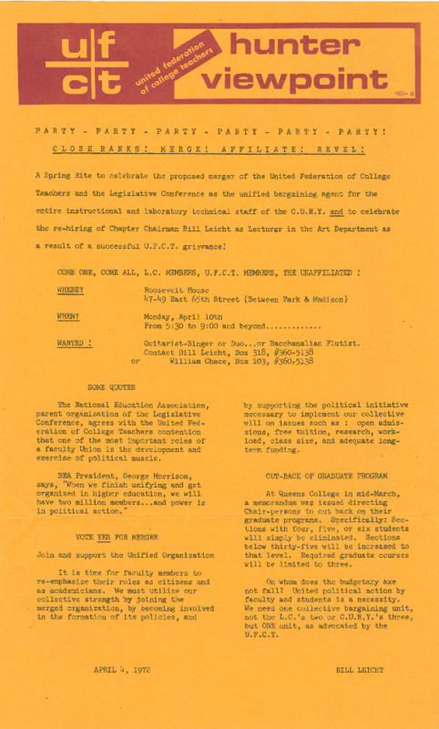 Leicht, Bill. Letter. “UFCT Hunter Viewpoint: ‘Close Ranks! Merge! Affiliate! Revel!’.”, CUNY DIGITAL HISTORY ARCHIVE, accessed March 10, 2026, https://stephenz.tailc22a4b.ts.net/s/cdha/item/457