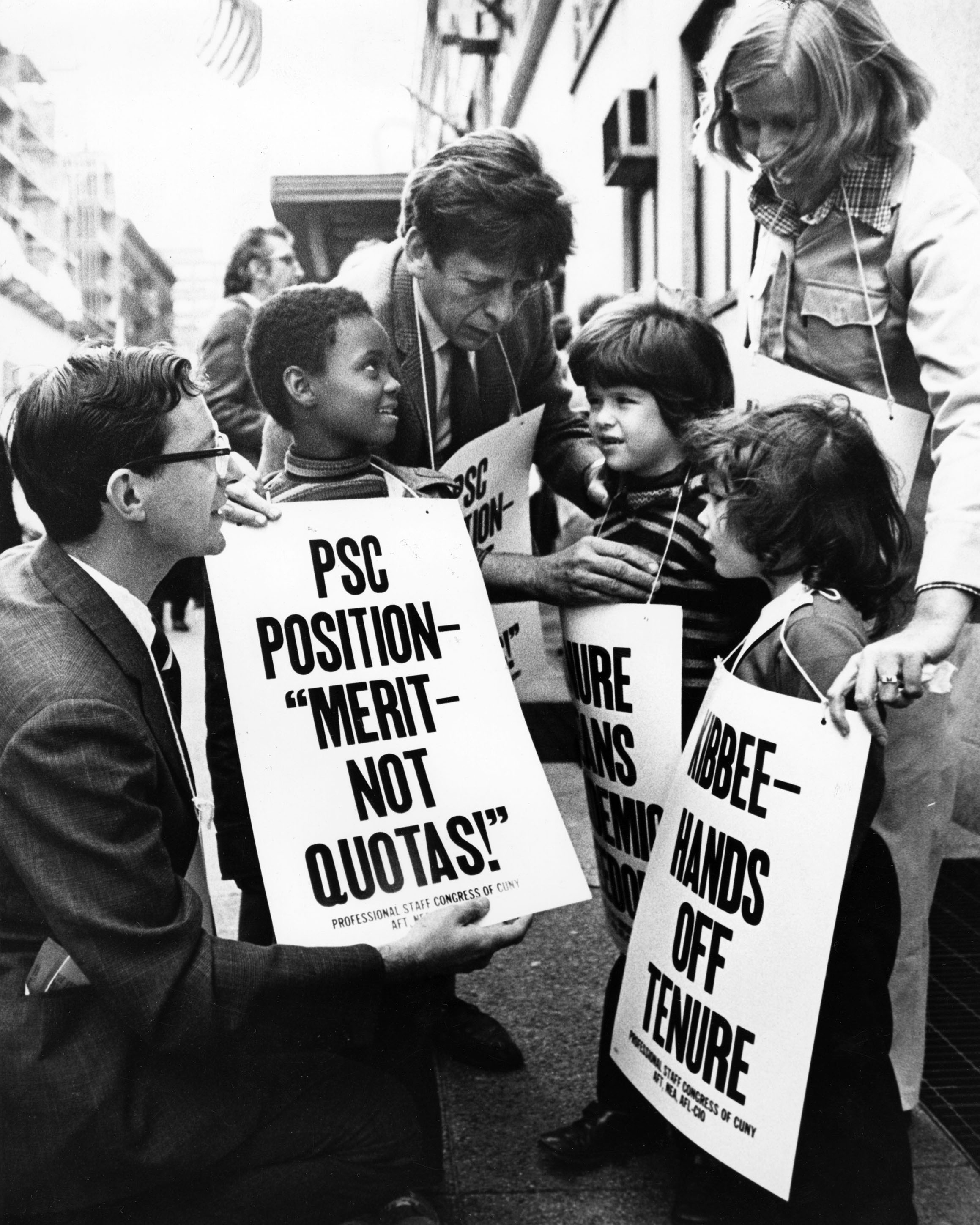 This photograph was used by the Professional Staff Congress (PSC) as part of its campaign against a 50% tenure quota policy for academic departments that had been announced by Chancellor Robert Kibbee, and then approved by the Board of Higher Education (BHE) on October 29, 1973. The PSC strongly fought against the policy and this photograph was part of its outreach to the general public. First Vice President of the PSC, Irwin Polishook, is on the left. Jerry Meyer, a union leader from Hostos Community College is in the background. The campaign was a success, and, on April 22, 1974, the BHE rescinded the tenure quota policy.