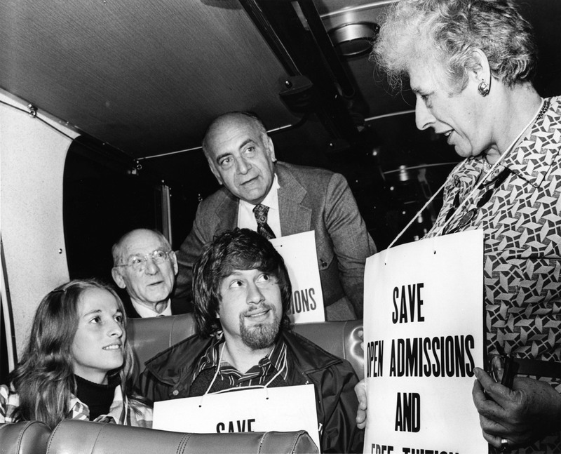 Belle Zeller, Professional Staff Congress (PSC) president, can be seen at the right with Israel Kugler, the union's deputy president standing at the back. The photo was taken on a bus trip to Albany to rally in support of Open Admissions. The PSC opposed cuts to the program's funding and also favored CUNY's continuation of free tuition. While Open Admissions would survive the decade, free tuition would come to an end in 1976 during New York City's fiscal crisis.