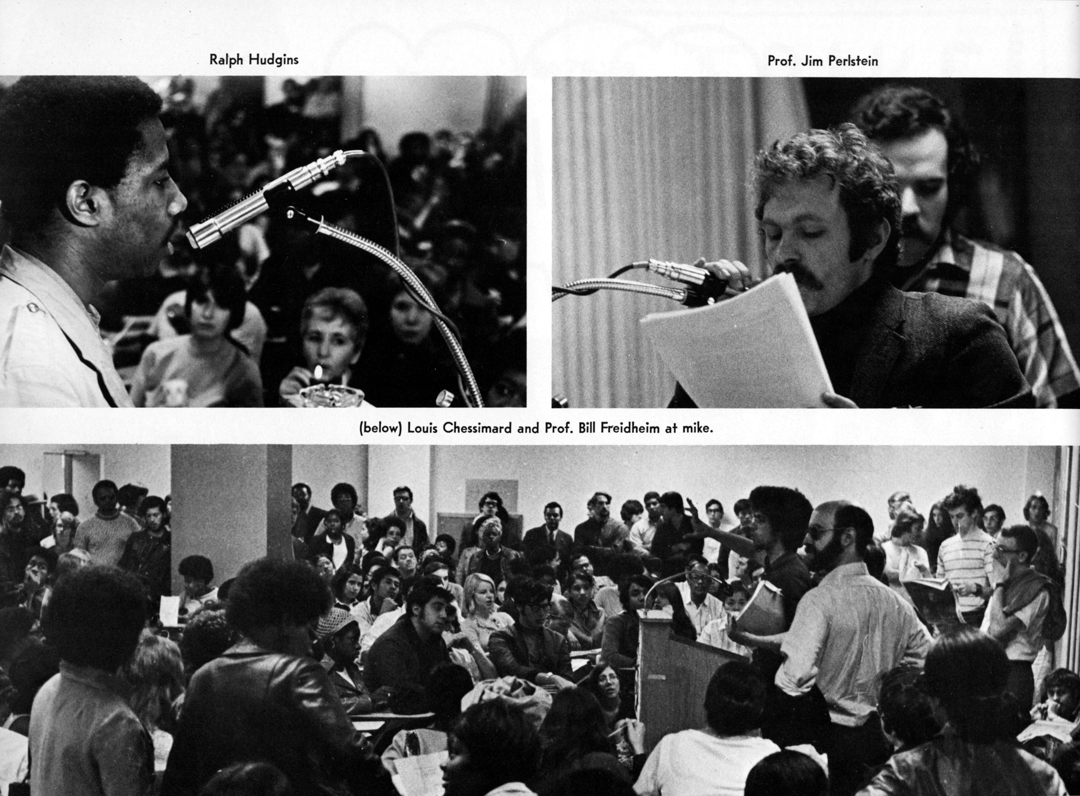 Printed in Prism, the BMCC 1971 yearbook, these photographs are part of a series that documents the student takeover of one of the BMCC buildings in May 1970. Faculty members Bill Friedheim and Jim Perlstein are shown speaking in support of student demands and about the larger anti-war movement. Student leader Ralph Hudgins (top left) was one of the student leaders speaking in support of a strike to shut down the school.