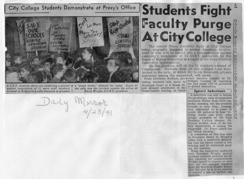 This article from the New York Daily Mirror discusses an April 23, 1941 student rally at City College (CCNY). The rally, planned initially as an anti-war peace demonstration, was expanded to include a protest against the recent suspension of 11 CCNY instructors. The instructors were suspended by the Board of Higher Education after their alleged ties to the Communist Party and their refusal to cooperate at the public hearings of New York State's Rapp-Coudert Committee. Students had protested outside of CCNY President Harry Wright's office in the previous days.