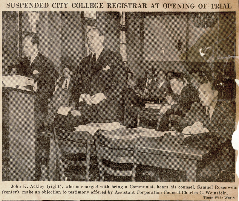 This newspaper clipping shows suspended City College registrar John K. Ackley sitting at his trial before the Board of Higher Education. Ackley had been identified for his Communist ties by the Rapp-Coudert Committee in April 1941. By June, he was the first City College employee to be tried and fired as a result of the committee's hearings.