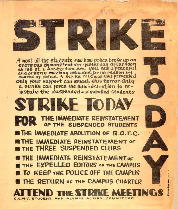 Many of the student grievances are expressed in this flier which calls for a strike in effort to "force the administration to reinstitute suspended and expelled students" from the May 29, 1933 protest. That protest, which took place during an ROTC review on campus, escalated with the arrival of police officers who had been called in by CCNY President Frederick B. Robinson. By protest's end, several left-leaning student organizations and publications would be shut down, and Robinson would be accused of attacking students with his umbrella.