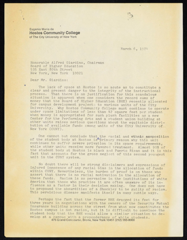 In this letter to the chairman of the Board of Higher Education in 1974, Hostos English professor, and Chapter Grievance Counselor, Wilfred Callender describes the inadequacy of the facilities at Hostos, pointing out how poor infrastructure has damaging effects on the quality of education a student can receive under such conditions. Professor Callender copied major newspapers on his letter to Chairman Alfred Giardino in an effort to draw attention to what he claimed was a clear expression of discrimination in how CUNY campuses were funded.