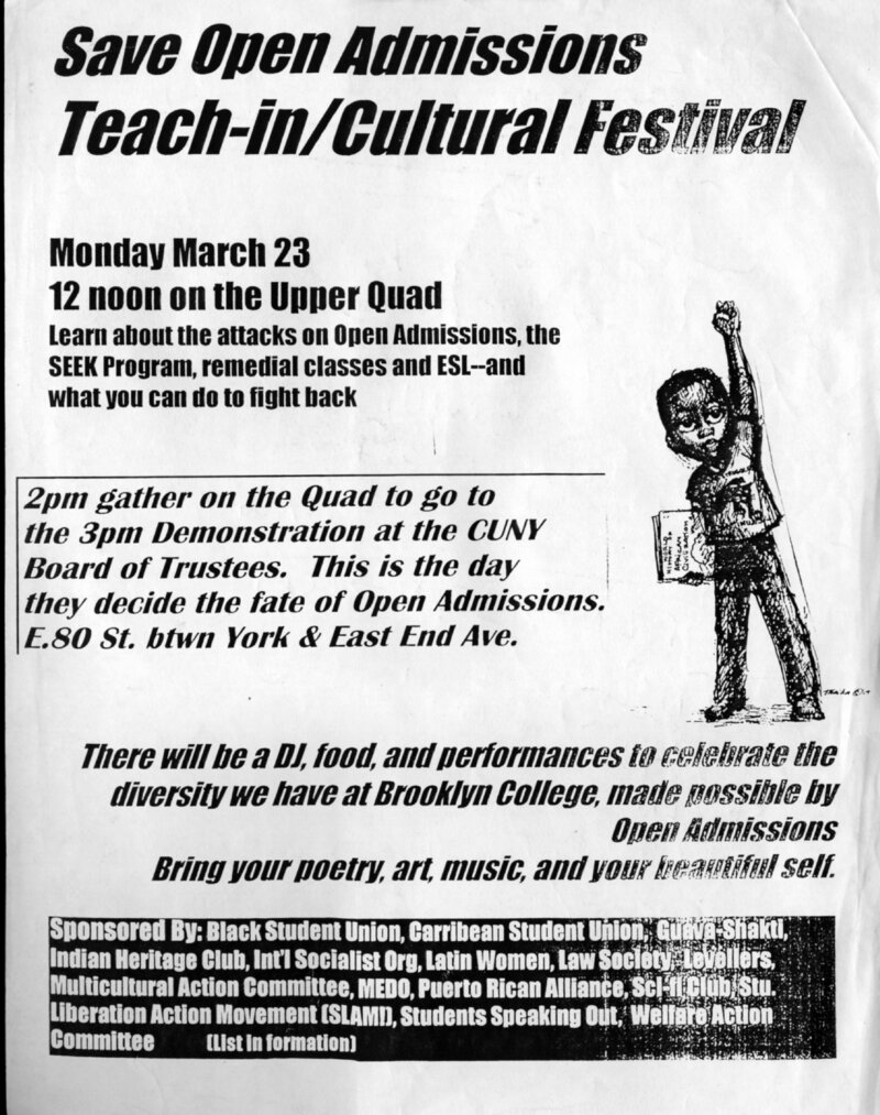 Brooklyn College SLAM!. Letter. 1998. “Save Open Admissions Teach-in - Cultural Festival”, 1998, CUNY DIGITAL HISTORY ARCHIVE, accessed March 10, 2026, https://stephenz.tailc22a4b.ts.net/s/cdha/item/62