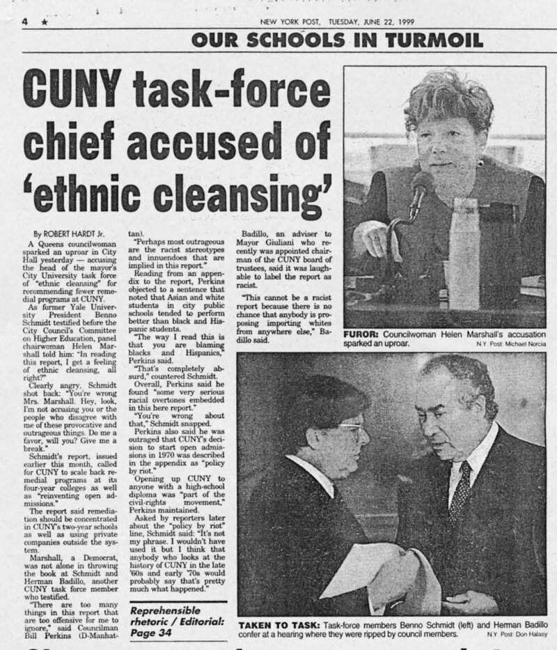 This New York Post article reports on a City Council Committee on Higher Education hearing at which council members remarked on the racism inherent in the effort of Mayor Giuliani's task force on CUNY to end open admissions.