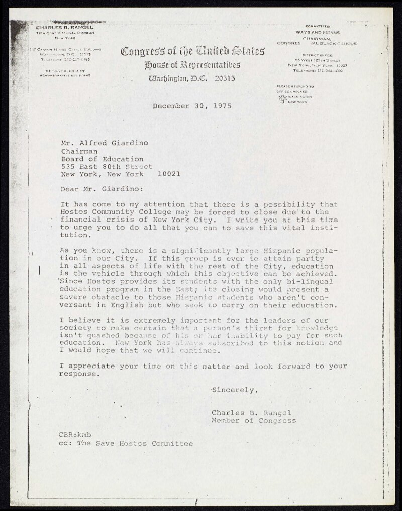 In December 1975 Congressman Charles Rangel wrote this letter to the Chairman of the Board of [Higher] Education, Alfred Giardino, to convey his opposition to the closure of Hostos Community College. As the United States Congressman representing a substantial portion of Hostos students, Rangel articulated that the preservation of Hostos Community College was crucial in order to offer opportunities for upward mobility for members of his district who relied on bilingual education.