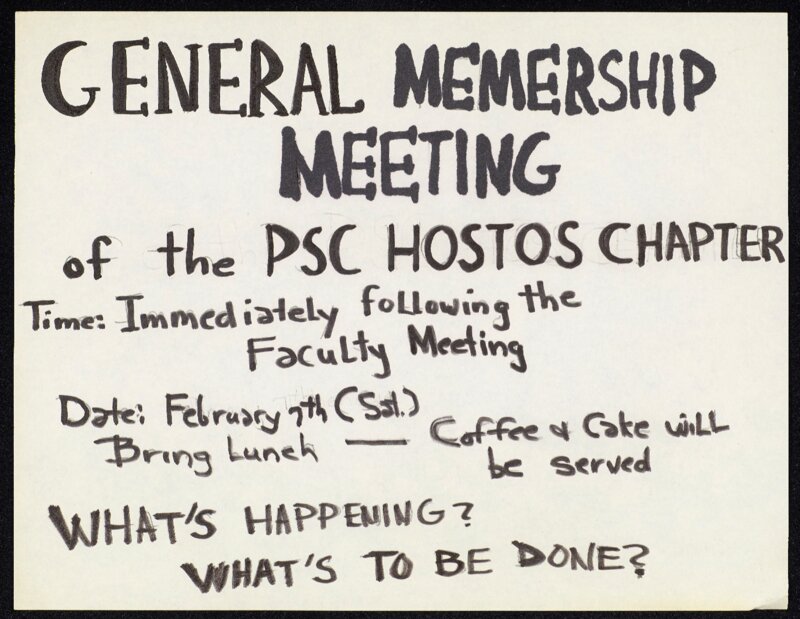 PSC Hostos Chapter. Letter. “General Membership Meeting - Hostos PSC Chapter.”, CUNY DIGITAL HISTORY ARCHIVE, accessed March 10, 2026, https://stephenz.tailc22a4b.ts.net/s/cdha/item/656
