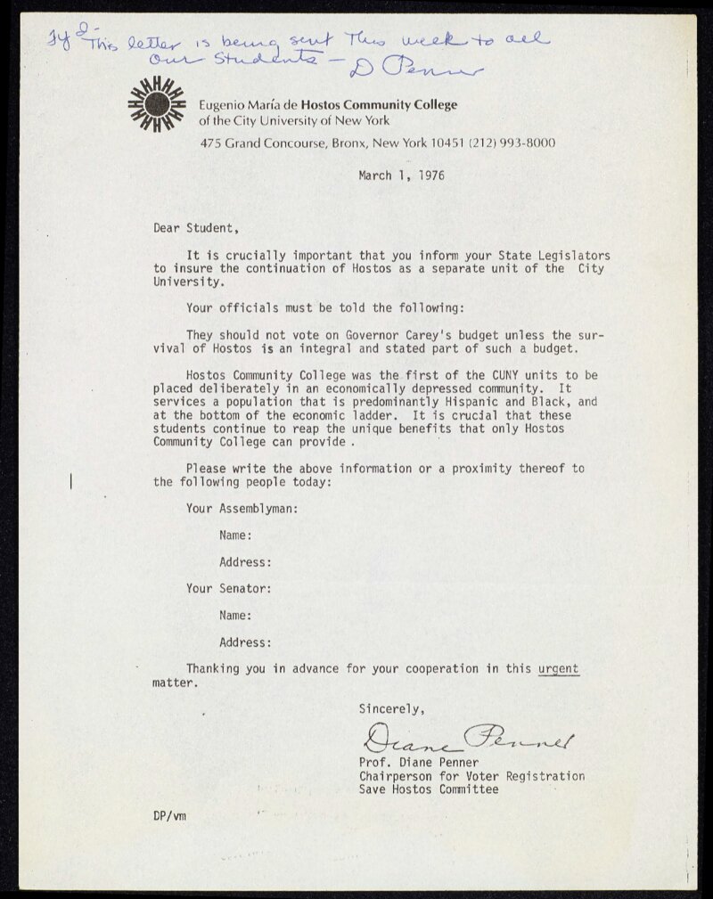 Professor Diane Penner wrote this letter to the Hostos Community College student body in 1976 to encourage them to pressure state officials to oppose Hostos’ closure. As a faculty member and activist on the Save Hostos Committee, Penner’s letter gave students instructions on how to urge their representatives to protect their school.