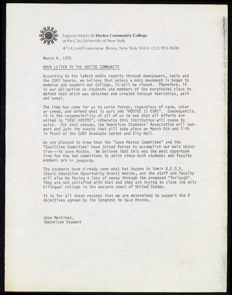 Martinez, Jose; Dominican Students Association. Letter. “"Open Letter to the Hostos Community" ‘Carta Publica a La Comunidad De Hostos’ from Jose Martinez.”, CUNY DIGITAL HISTORY ARCHIVE, accessed March 10, 2026, https://stephenz.tailc22a4b.ts.net/s/cdha/item/660