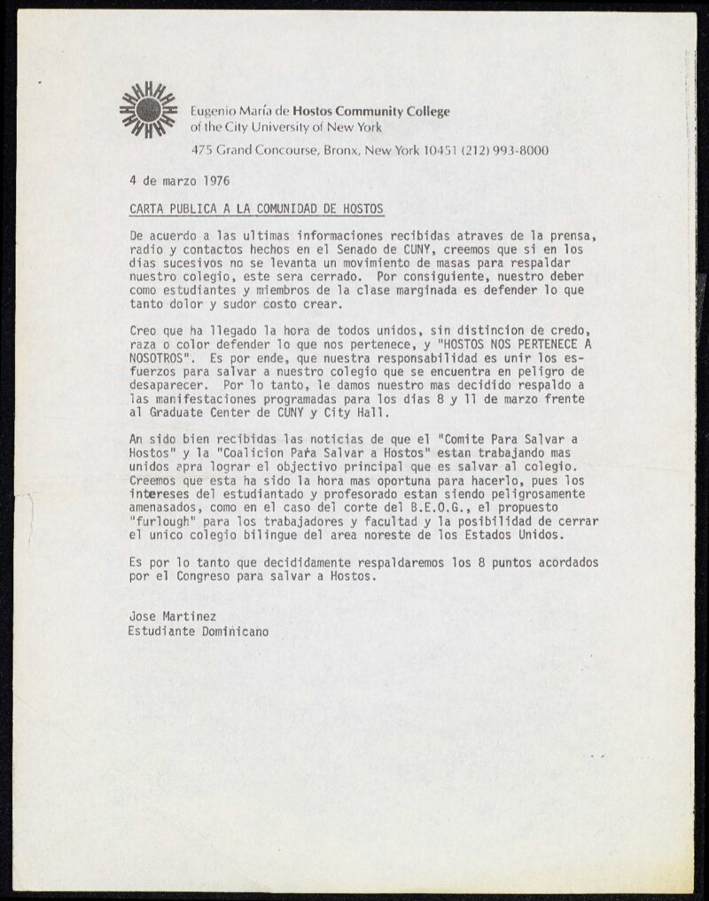 Jose Martinez wrote this open letter in both English and Spanish to the Hostos Community College community on behalf of the Dominican Students Association to state that the vulnerability of the college had become so dire that massive collective action had become necessary. Under threat of closure, student and community groups needed to join forces to prevent the City University of New York from closing the only bilingual college available for people in the South Bronx and the only such college in the eastern United States.