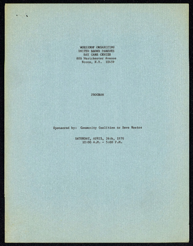 The Community Coalition to Save Hostos hosted an all-day workshop to train members of the South Bronx community in organizing skills, strategies, and challenges in April of 1976. This program outlines the events of the day. The Community Coalition to Save Hostos was a collaboration between student and faculty groups and community organizations dedicated to preventing the closure of Hostos Community College.