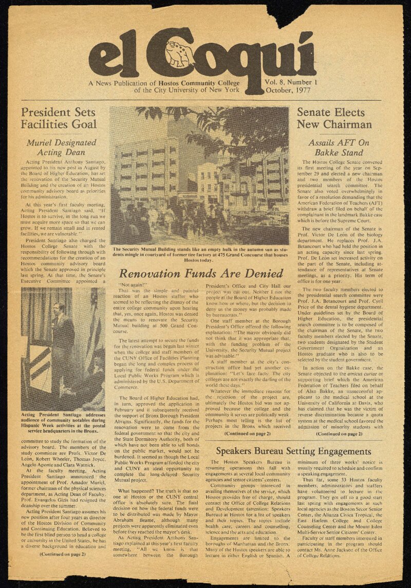 El Coquí was a college newspaper published monthly by the Office of College Relations and Development at Hostos Community College. This October 1977 issue featured stories on the new agenda of the incoming Acting President of the college Anthony Santiago, in the wake of Candido Antonio de Leon’s resignation. Additionally, this issue described the failure of the school to secure federal funds for the renovation of the 500 Grand Concourse building through the Local Public Works Program. The school had hoped that an application for federal assistance would bring the college needed funding to move forward on its expansion.