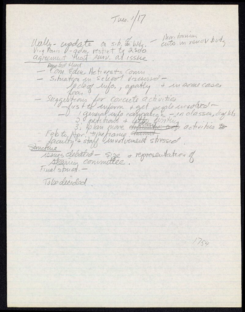 These handwritten notes were taken during the meeting in which leaders of student and labor groups decided to form Hostos United/Hostos Unido. The group became the central activist organization that led much of the campaign to expand the college to 500 Grand Concourse. It was organized by the Student Government Organization, the Puerto Rican Student Organization, the Dominican Student Organization, the South American Student Union, the Black Student Union, FUSP, the Professional Staff Congress and other unions representing college staff. These notes capture the various positions of different organization leaders and the distribution of labor that was agreed upon by the participants. They also describe the debates about governing structure, and the initial strategic decisions that would inform activist efforts in the coming three months.
