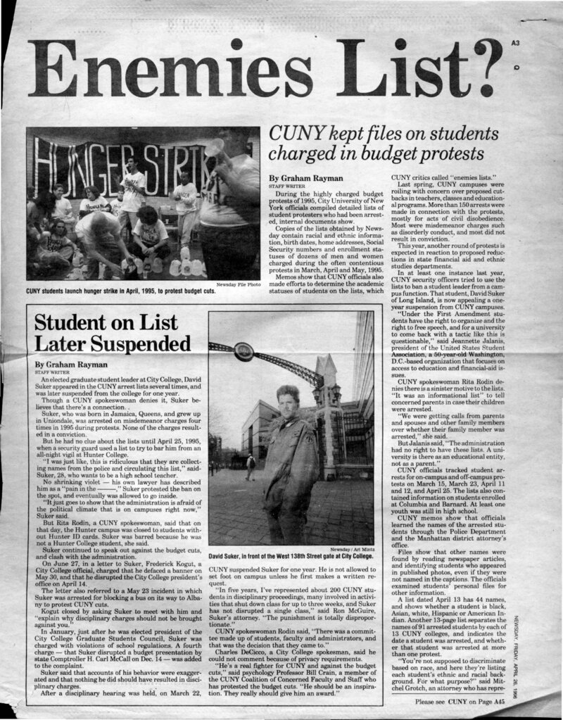 In this pair of articles from the Long Island, NY based Newsday, writer Graham Rayman details the efforts of CUNY officials to track and document the activities of student activists during the budget protests of 1995. Rayman's first article considers both how CUNY compiled the information on their students and what they attempted to do with it. His second story focuses on the experiences of one CCNY student whose name appeared on one of CUNY’s “enemies lists,” as they were referred to by the university’s critics.