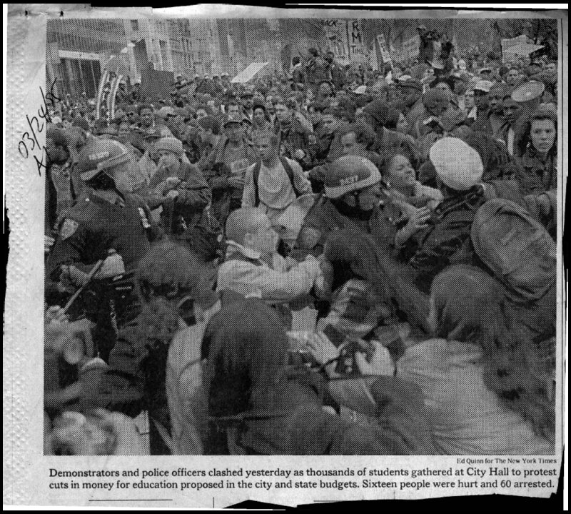 This front-page, above-the-fold New York Times coverage of the CUNY Coalition's March 23, 1995 protest reports that thousands of students walked out of class to protest the proposed state and city budget cuts to CUNY. The article relies mainly on perspectives from police leadership, Mayor Giuliani, and Governor Pataki on the protest, which leaves the reader with a sense that unruly and ungrateful students took the streets to wreak havoc for very little reason.