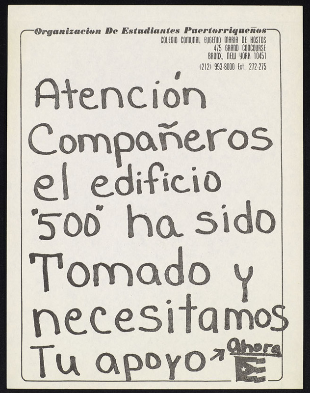 Organización De Estudiantes Puertorriqueños. Letter. 1978. “"Atención Compañeros, El Edificio "500‘ Ha Sido Tomado’”, 1978, CUNY DIGITAL HISTORY ARCHIVE, accessed March 10, 2026, https://stephenz.tailc22a4b.ts.net/s/cdha/item/754