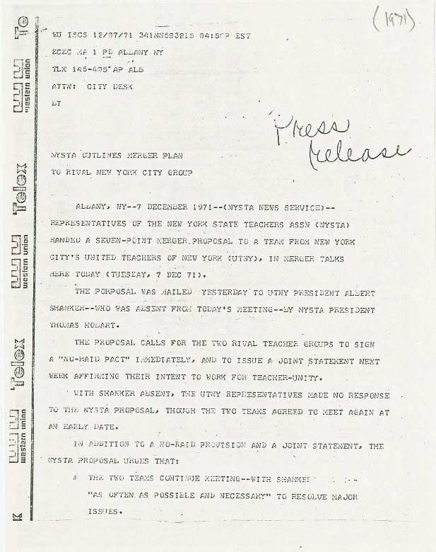 In this press release, representatives from the New York State Teachers Association (NYSTA) propose steps for a merger with the United Teachers of New York (UTNY). The NYSTA had previously been affiliated with the National Education Association (NEA), which in turn had been affiliated with Legislative Conference (LC) at CUNY. The LC's rival union, the United Federation of College Teachers (UFCT) meanwhile had been affiliated with the American Federation of Teachers (AFT), which had been connected to the UTNY.