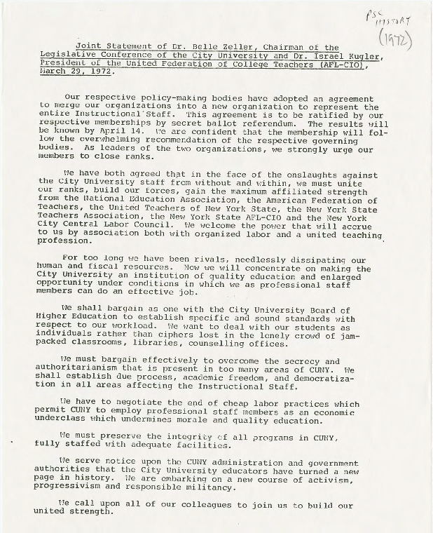 In this statement, President Belle Zeller of the Legislative Conference and President Israel Kugler of the United Federation of College Teachers announce the merger of the two rival unions, and call on the members of each organization to ratify the merger in a secret ballot referendum. They note the need for unity to end the dissipation of their resources. They also stress the problems facing CUNY, and its faculty and staff, which would require a unified union to have the maximum influence on events. The membership of each union strongly endorsed the merger, which took place on April 14, 1972.