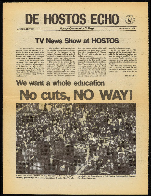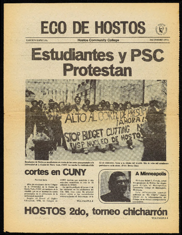 Eco de Hostos was a bilingual student newspaper published monthly by the Office of College Relations and Development. This December 1974 issue (Spanish language edition) features an article about students, faculty and the PSC protesting against drastic budget cuts in front of the Board of Higher Education.
