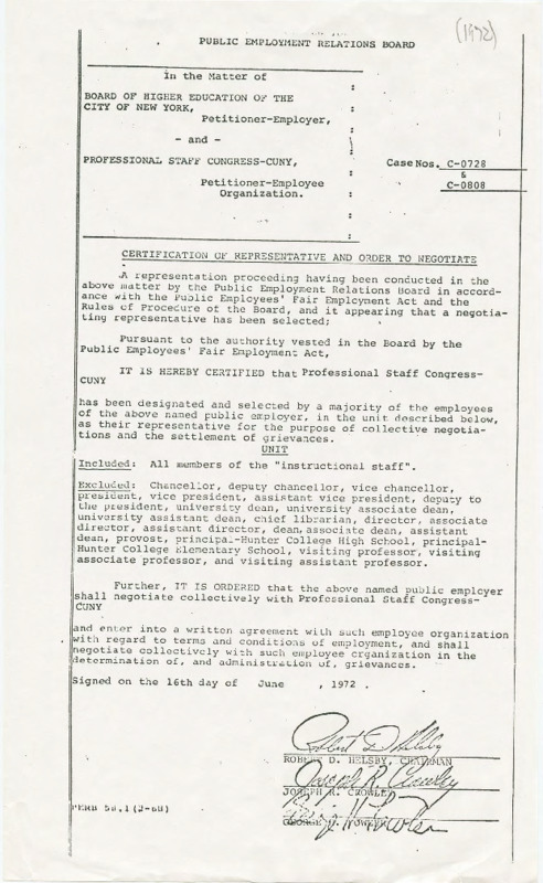 This document from the Public Employment Relations Board, a New York State agency, certifies the newly formed Professional Staff Congress (PSC) as the union representation for CUNY instructional staff. Issued in June 1972, the order by PERB followed the merger of the formerly competing unions in April 1972, and the approval of the merger in a referendum by the CUNY faculty and staff. The new, united union, became the sole collective bargaining agent for all faculty and staff in CUNY.