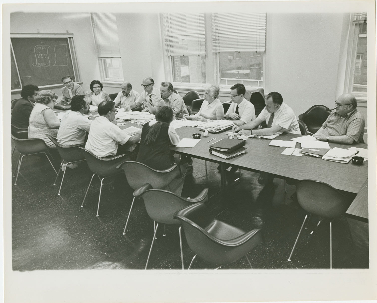 This photograph shows the first meeting of the newly formed Professional Staff Congress (PSC) contract negotiating committee with CUNY administration. Negotiations were difficult and an agreement was not reached until July 1973.