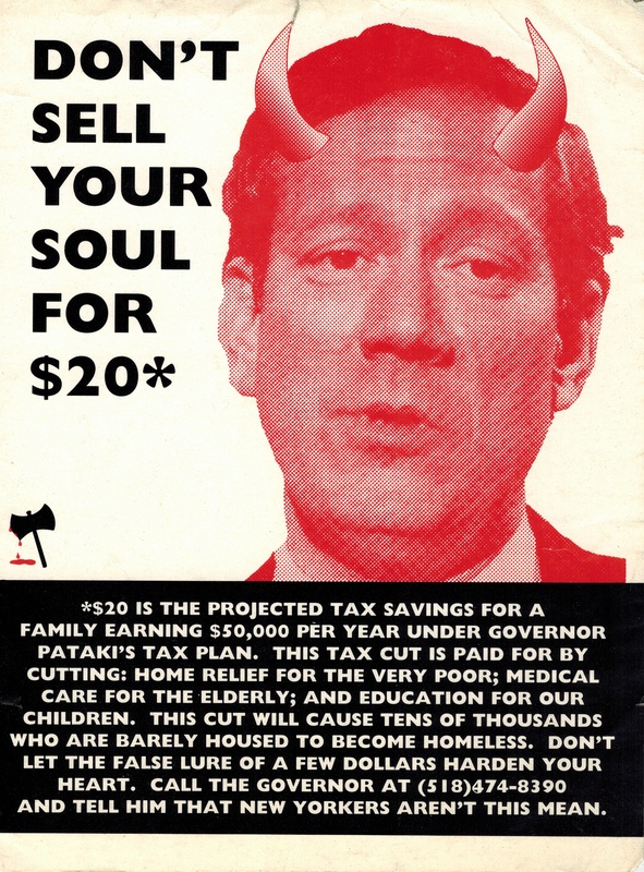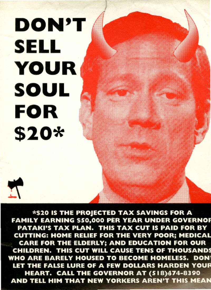 A two-color sticker with an image of Pataki with "devil" horns. The sticker explains that the estimated projected tax savings for a family earning $50,000/year would be $20, while programs for students, the elderly and the poor would be cut. Activists put this sticker on subway cars and public surfaces all over the city to build on the popular outrage against the budget cuts, which went beyond the cuts to CUNY and allowed for broad coalition work between many constituencies.