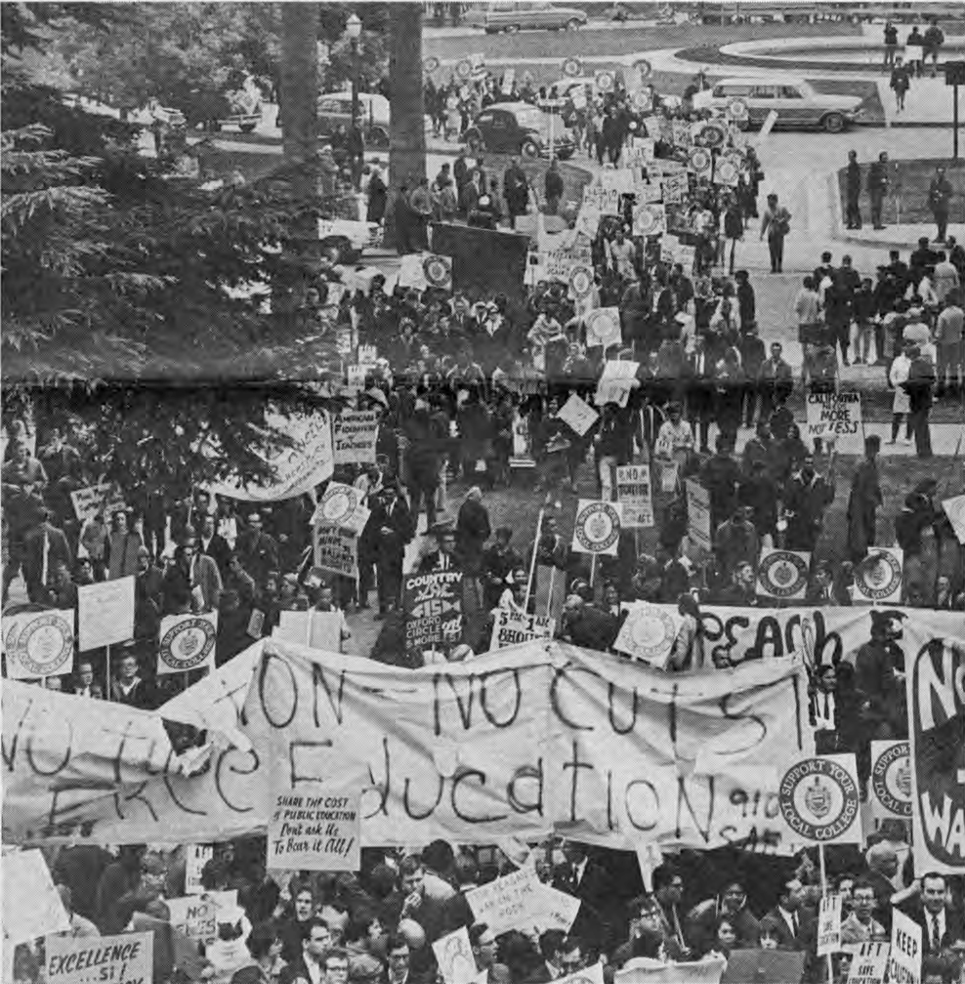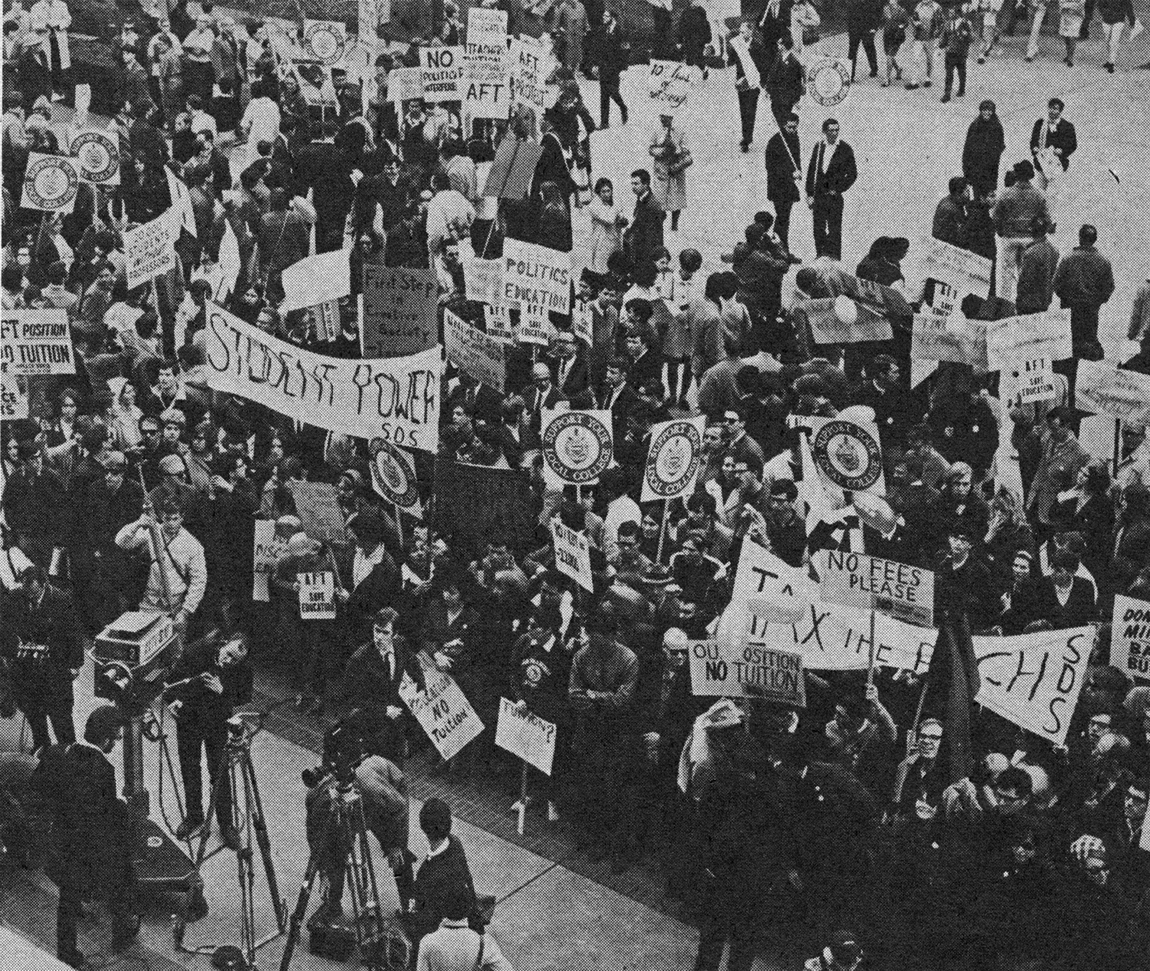 These uncaptioned images accompanied an article in the May 1969 issue of Action, the monthly newspaper of the United Federation of College Teachers. Clearly representing a range of organizations and political positions, the focus of this demonstration was generally one that supported public education. Signs from SDS (Students for a Democratic Society) read "Tax the Rich" and "Student Power. " And AFT (American Federation of Teachers) signs read "AFT: Save Education" and "AFT Position, End Tuition." Others say: "Support your local college," "No Fees Please" "No Tuition No Cuts - Free Education" and "Share the Cost of Public Education - don't Ask me to Bear it all."