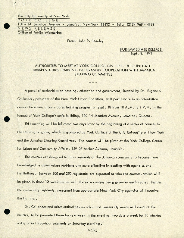 In this press release, York College officials announce the start of the newly created Urban Studies Training Program during the Fall 1971 semester. Originally announced in May '71, the program offered a variety of courses "designed to train residents of the Jamaica community to become more knowledgeable about urban problems and more effective in dealing with agencies and institutions." With 200-250 participants expected in its initial semester, the federally funded program was created with the help of the Jamaica Steering Committee, a group comprising more than 100 neighborhood organizations.