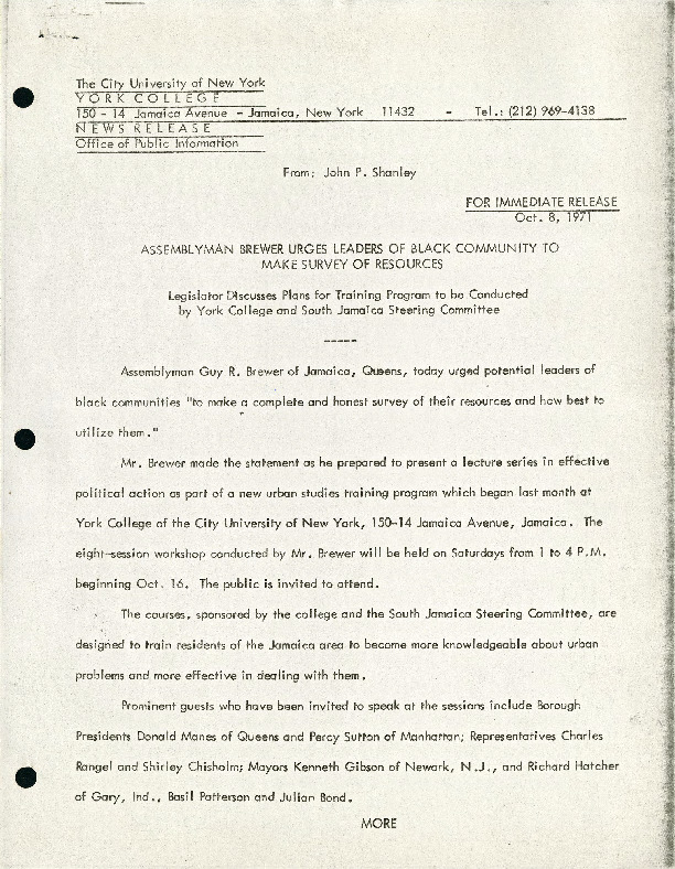 This press release from York College features statements from state assemblyman Guy Brewer as promotion for the college's community-focused urban studies training program. Brewer, a lecturer in said program, is quoted urging Jamaica, Queens leaders to "learn how the actual strength of their communities can be 'catalogued, cross-filed and mobilized when need be in a way that will guarantee their maximum 'clout' on the political power structure."