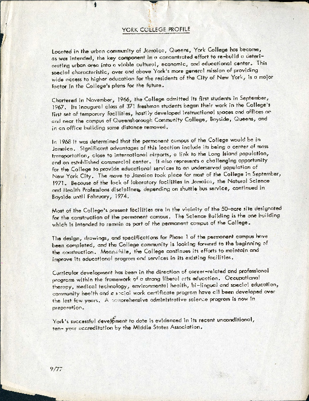 This short profile of York College was likely produced by the college itself in September 1977. The one-page item briefly traces the history of the college from its establishment in 1966 and its temporary housing in Queensborough Community College through to the school's then still temporary facilities in Jamaica. As noted, the college represented CUNY's commitment to locating a four-year school in an underserved NYC community.