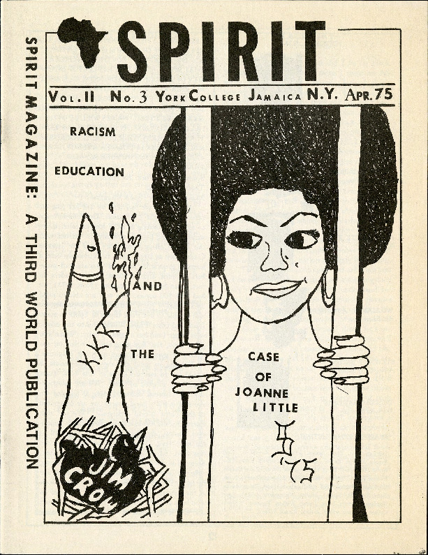 These selections are from the April 1975 issue of the York College student-run Spirit Magazine. The publication typically focused on the concerns and needs of the college's large black student population.The magazine's cover features Joanne Little, an African American woman charged with the murder of a white prison guard in a North Carolina jail in 1974. A lengthy article in this issue details the state's desire for the death penalty. Several months after the magazine's' printing, however, a jury found Little not guilty by way of self-defense. Among the other items included is an article detailing the Pan African Skills Project, an initiative created to bring skilled workers to places like Tanzania. The program's recruitment process and history are described in some detail. In another article, a York College student attempts to investigate claims of racism and discrimination on campus. Alleging, among other things, questionable hiring practices on the part of the college's administration, the article concludes that the present instructional staff, for several reasons, fails to contribute to the larger Jamaican community outside of the school.Finally, a memorial piece can be found for Clifford Glover, a 10-year old boy killed by a police officer in Jamaica, Queens in 1973. His death, which came as he was running away, the officer's later acquittal, and the riots that followed all remained in the neighborhood's collective memory in subsequent years.
