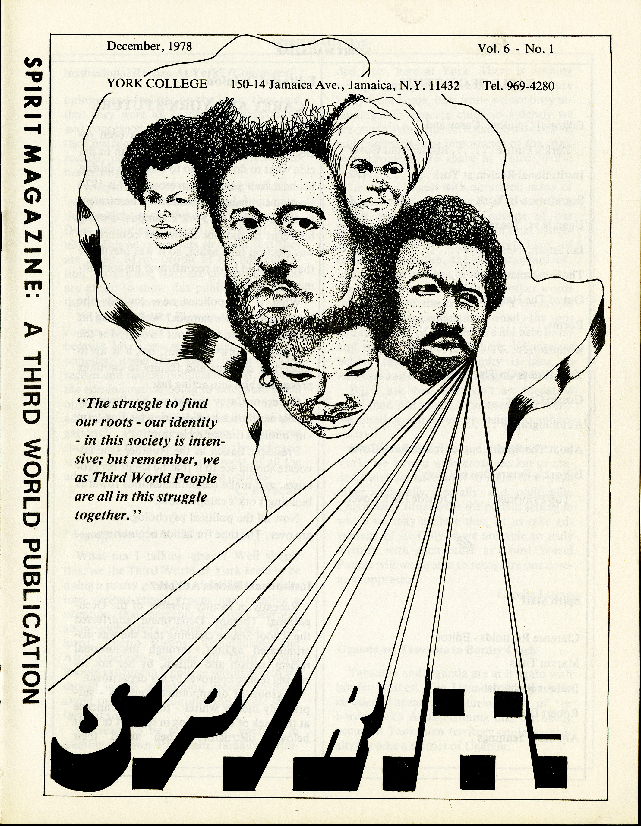 This is the cover of the December 1978 issue of the York College student-run Spirit Magazine. Feauturing drawings depicting African-American women and men over the continent of Africa, it also includes a quote that aptly reflects the mission of the magazine. A self-described "third world publication," Spirit was the creation of York College students and reflected the concerns and priorities of the college's large black student population.