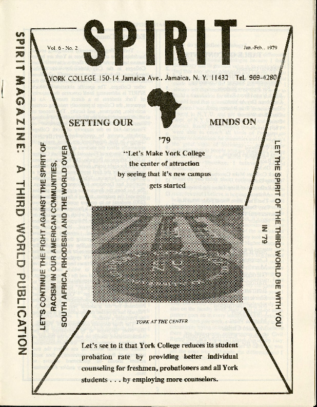 The variety of the headlines found on this cover of the January 1979 issue of Spirit Magazine reflect the many concerns of the York College student-run publication. Framed as hopes for the upcoming year, the magazine calls for: a continued fight against racism in the U.S. and abroad, better counseling at the college for academically struggling freshman, and the construction of a new college campus. Featured perhaps most prominently, the call for a new campus was hardly unique to 1979. Plans for construction were announced as early as 1972, however, the city's economic woes delayed development forcing the college to rely on a scattered mix of rented and owned properties in Jamaica, Queens. It was not until 1986, twenty years after the college's founding, that the school opened the first of its permanent buildings on its present campus. Spirit Magazine, a self-described "third-world publication", was the creation of York College students and reflected the concerns and priorities of the college's large black student population.