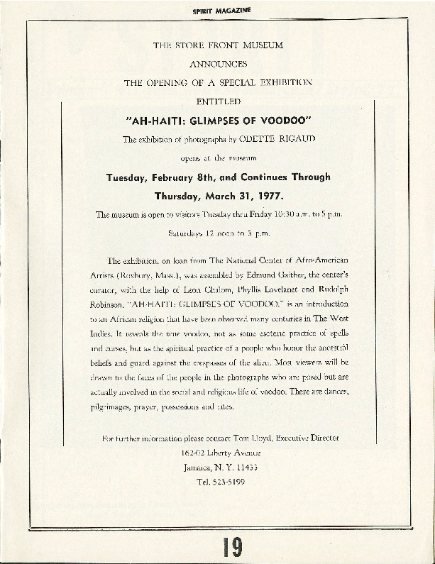 This advertisement from an issue of the York College student-run Spirit Magazine, demonstrates the strong relationship between students at the college and the surrounding community. The ad announces a photography exhibition entitled "Ah-Haiti: Glimpses of Voodoo" at the Store Front Museum in Jamaica, Queens. The mission of the museum, which was founded in 1971 with the goal of promoting African-American culture, aligned closely with the aims of Spirit. A self-described "third world publication," the magazine typically focused on the needs and concerns of York's large black student population placing particular emphasis on heritage and tradition.