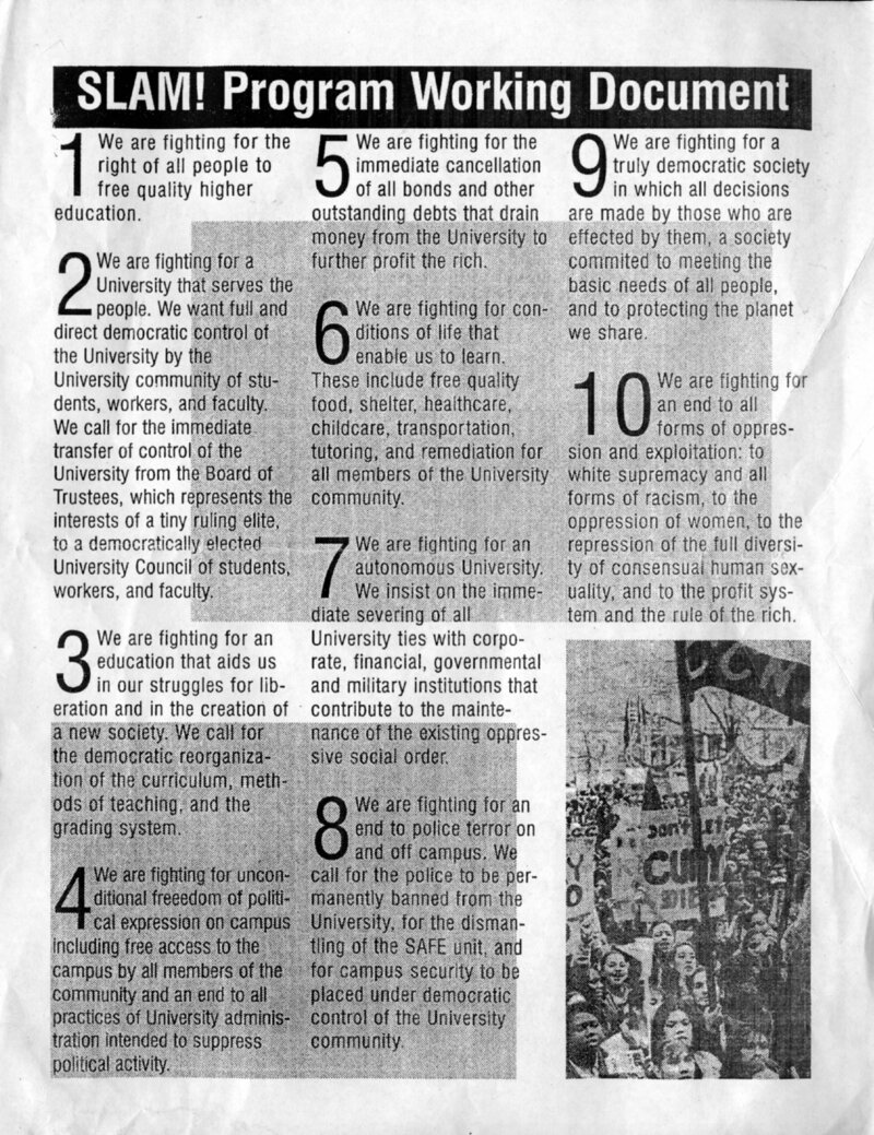 Student Liberation Action Movement, SLAM!. Letter. 1996. “SLAM! Program Working Document”, 1996, CUNY DIGITAL HISTORY ARCHIVE, accessed March 10, 2026, https://stephenz.tailc22a4b.ts.net/s/cdha/item/79