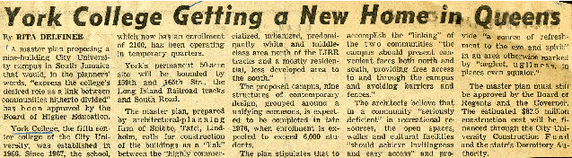 This New York Post article details the Board of Higher Education's approval of the 1970 master plan for York College's campus construction. While the plan still needed a final go-ahead from the Board of Regents and Governor Nelson Rockefeller, the proposed 50-acre, nine building campus was estimated to be completed by late 1976. The city's fiscal crisis during the decade, however, would delay construction and the college would not see the opening of its campus until 1986. Until then, York had relied on rented and temporary spaces throughout Queens since its founding in 1966. CUNY's commitment to a four-year college in Jamaica offered great promise for many in the often overlooked neighborhood.
