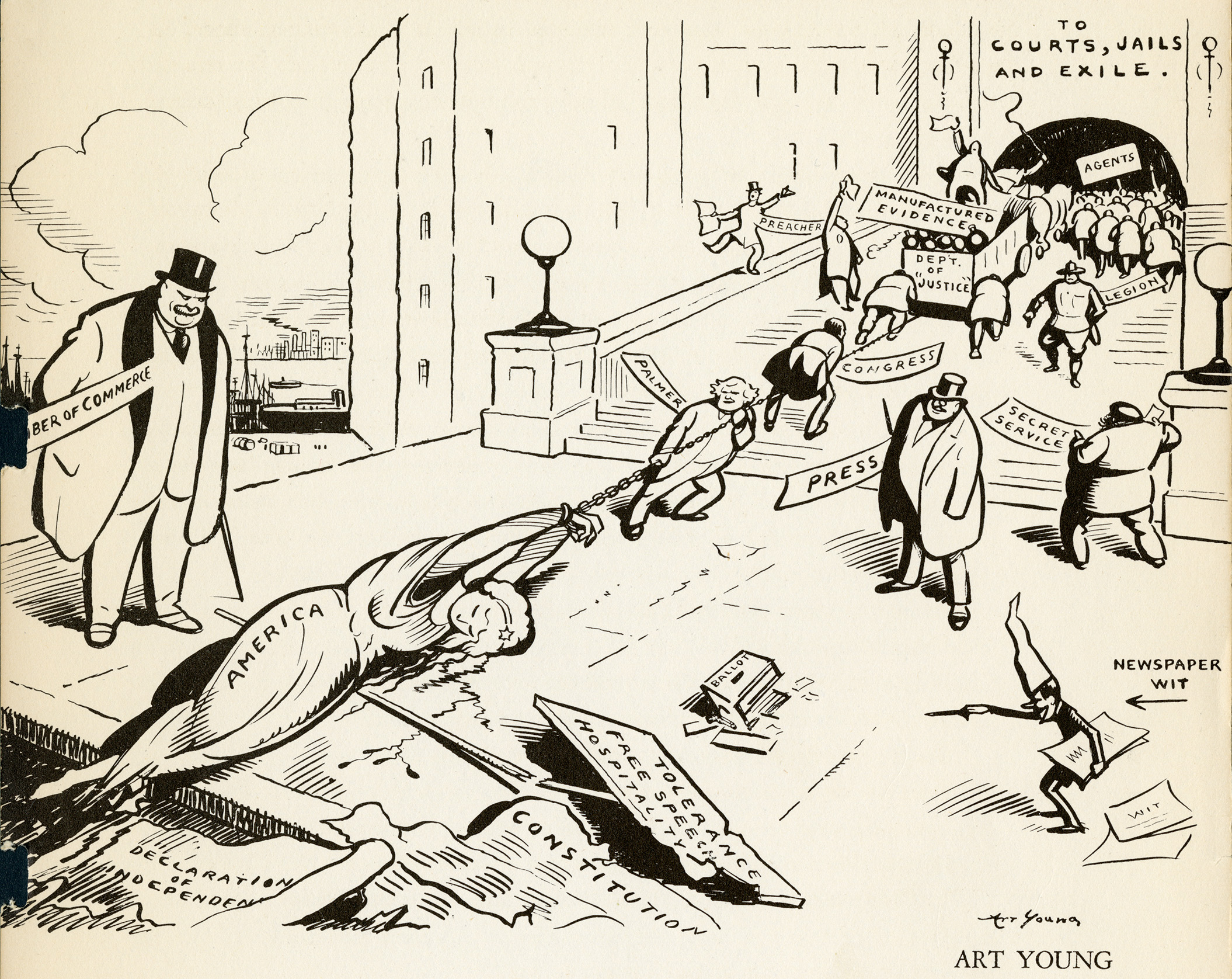 Art Young, a socially conscious cartoonist and writer, created this cartoon for inclusion in the 1941 book, Winter Soldiers: The Story of a Conspiracy Against Schools. The book, published by the Committee for Defense of Public Education, tells the story of the Rapp-Coudert hearings and New York State’s efforts to rid its public schools and colleges of "subversive influences" and persons, particularly those with communist ties.
