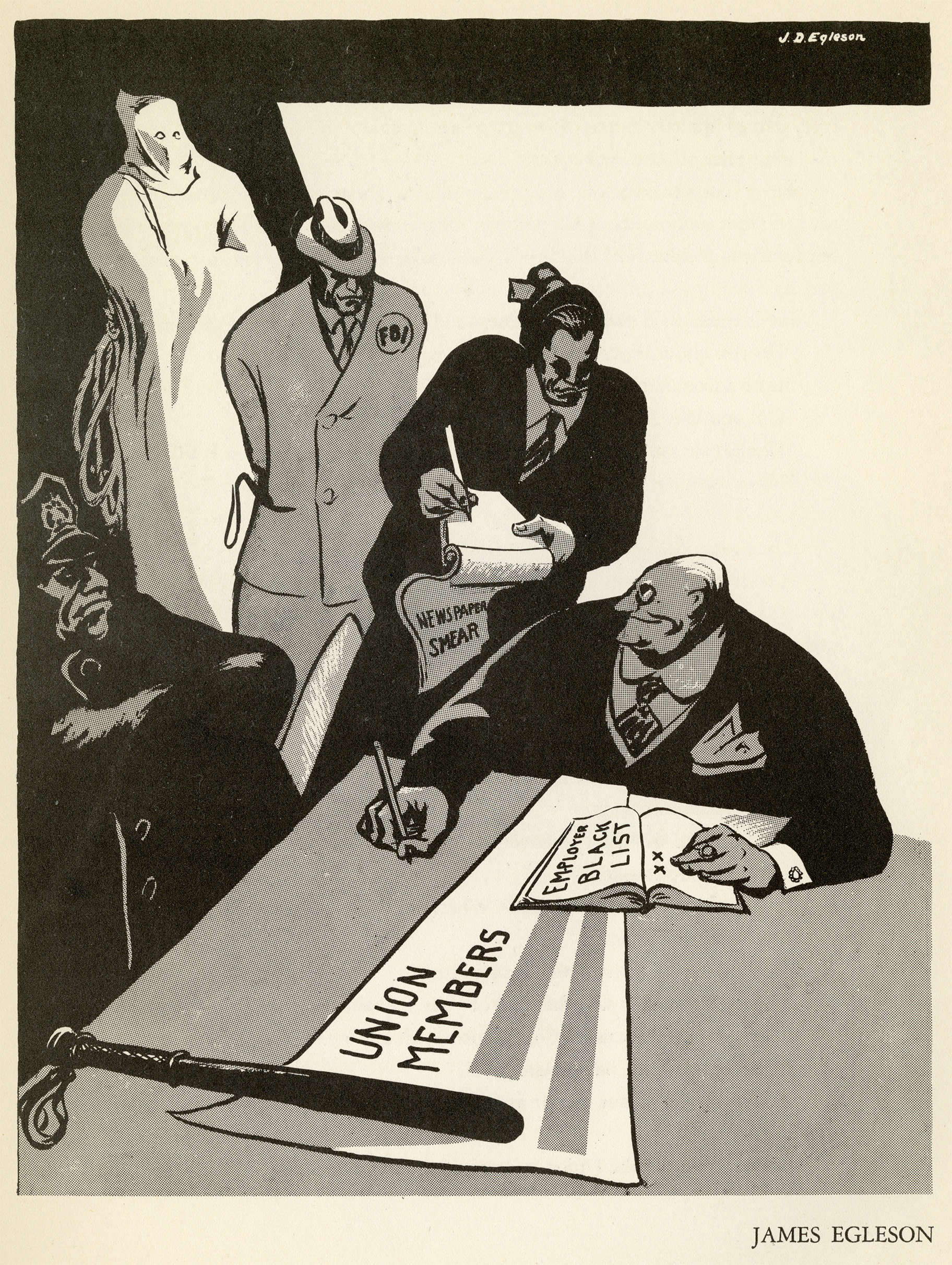 James Egleson, an American WPA artist, created this illustration for inclusion in the 1941 book, Winter Soldiers: The Story of a Conspiracy Against Schools. The book, published by the Committee for Defense of Public Education, tells the story of the Rapp-Coudert hearings and New York State’s efforts to rid its public schools and colleges of "subversive influences" and persons, particularly those with communist ties. Egleson was supported under the Works Progress Administration (WPA), the government-funded Federal Art Project that hired hundreds of artists. The Project was part of President Franklin D. Roosevelt's New Deal during the Great Depression.
