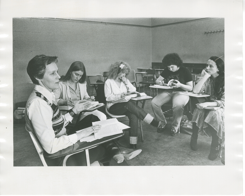 This photograph shows Tucker Pamella Farley (left) teaching her popular Women and Literature course in a discussion circle with her students. Farley taught at Brooklyn College from 1970 to 2005, where she was central to developing the Women’s Studies Program as program co-founder, and taught English and Women’s Studies courses. She fought for and secured funding for the first Women’s Center on campus, creating Project Chance for returning women students. The Women's Center is still running today as one of the oldest college women's centers in the country.