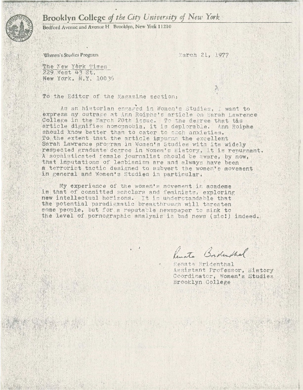 This letter, penned by Women's Studies Program co-founder and historian Renate Bridenthal, was sent to the New York Times Magazine editor after they ran a story about Sarah Lawrence's women's studies program in which the journalist pandered to fears of faculty spreading lesbianism amongst students. Bridenthal's firm reply calls out the tactic for what she called an attempt to "subvert the women's movement in general and Women's Studies in particular," and shows a broad kinship with and commitment to the field of women's studies.