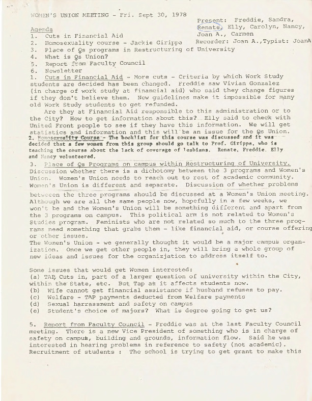 The Women's Union at Brooklyn College was an organization comprised of many faculty and staff from the Women's Studies Program, but existed as a separate entity that would tackle political and administrative issues affecting women at the college. These notes from their inaugural meeting reflect the types of advocacy they tackled, from fighting for courses that explored lesbian sexuality to addressing cuts to student financial aid, welfare, and TAP, sexual harassment and safety on campus, and the ways that married women could be excluded from financial assistance.