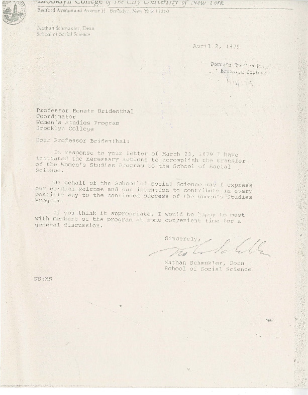 This letter from Nathan Schmukler, Dean of Social Sciences at Brooklyn College welcomes the transfer of the interdisciplinary program in Women's Studies to the College of Social Sciences. The Women's Studies steering committee had advocated for the move from Humanities to Social Sciences in order to realize the program's goals of more co-taught courses and a broader scope of interdisciplinary content.