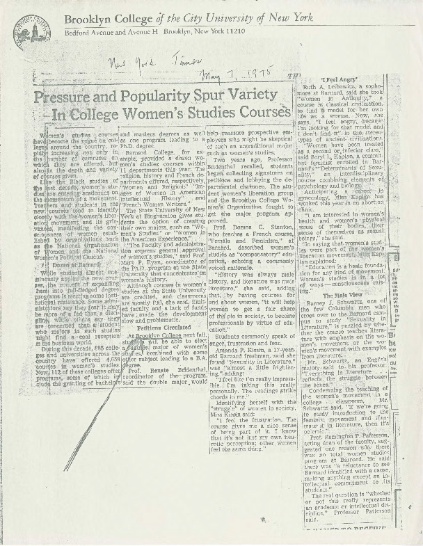 This New York Times article chronicles the advent of the establishment of women's studies programs at universities across the country in the 1970s, featuring the newly established double major at Brooklyn College. Program co-founder and co-coordinator Renate Bridenthal (History) was interviewed: "Two years ago, Professor Bridenthal recalled, students began collecting signatures on petitions and lobbying the departmental chairmen, the student women's liberation group, and the Brooklyn College Women's Organization (BCWO) fought to get the major program approved." However, the article gives the last word to the male dean of faculty at Columbia University, reinforcing the climate of sexism within the academy: "The real question is 'whether or not this really represents an academic or intellectual discipline.'" This article demonstrates the frequent efforts to delegitimize women's studies that organizers faced, which reinforced their evidence for the importance and need for their work.